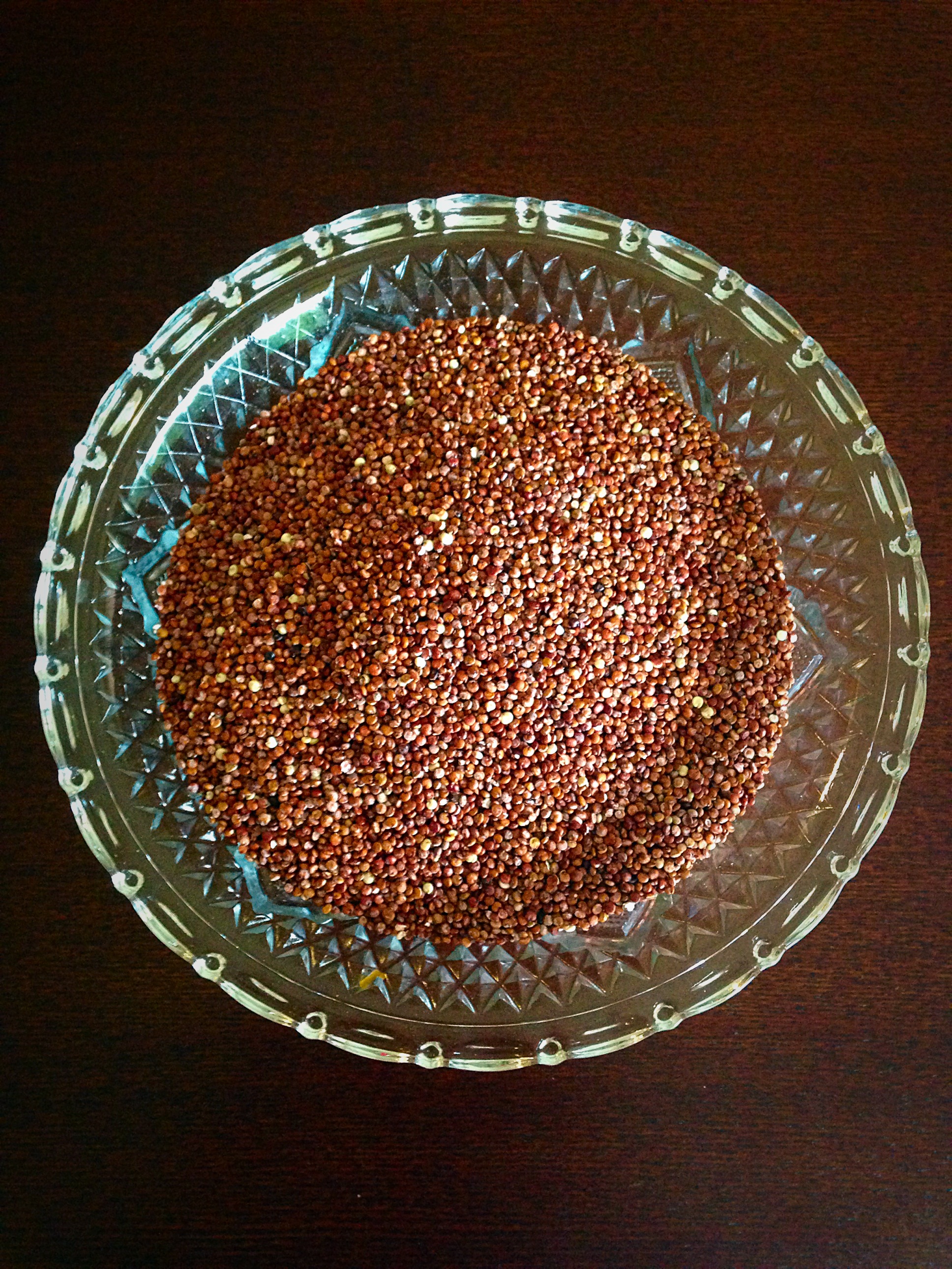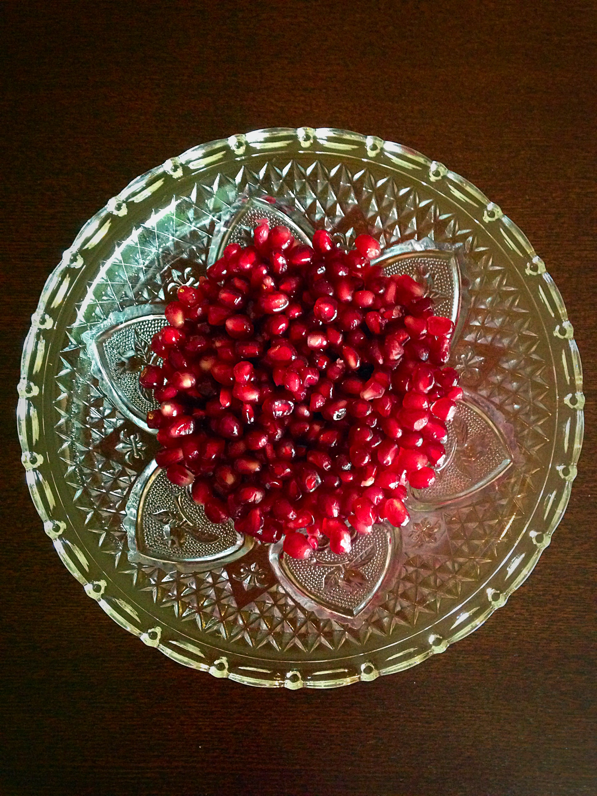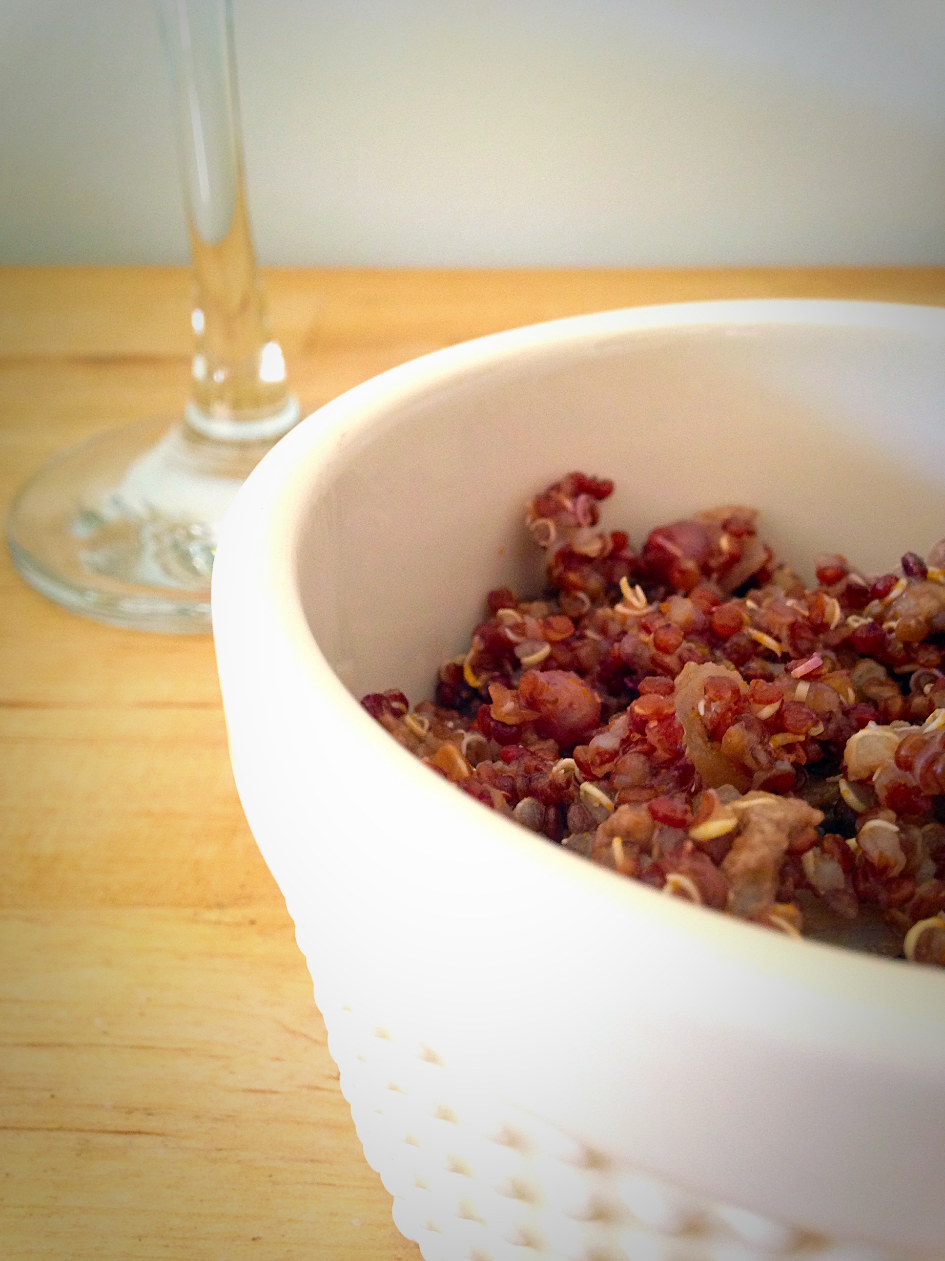 2. In a large pot, cook quinoa according to directions and add tomatoes, pomegranates and red pepper.