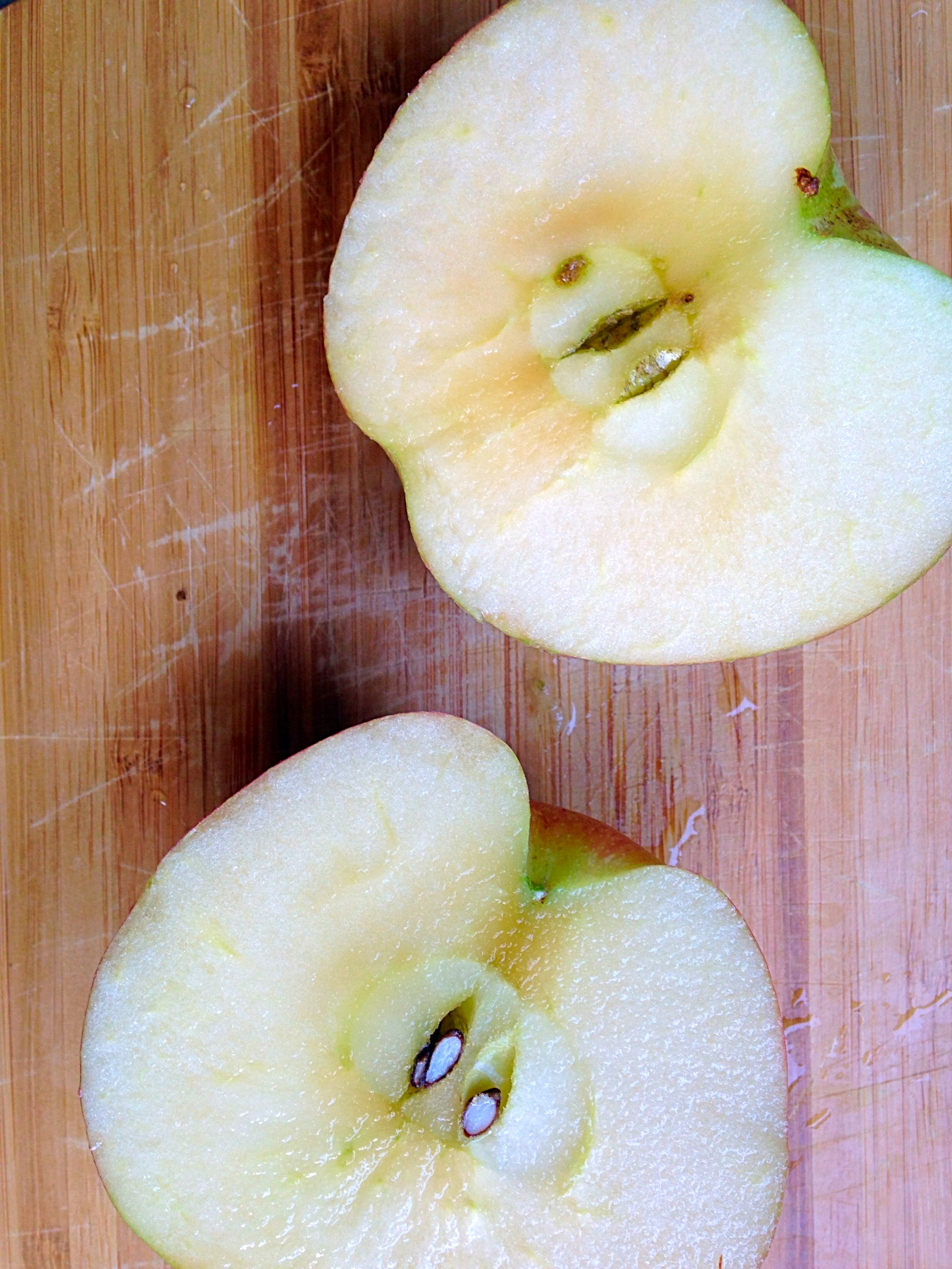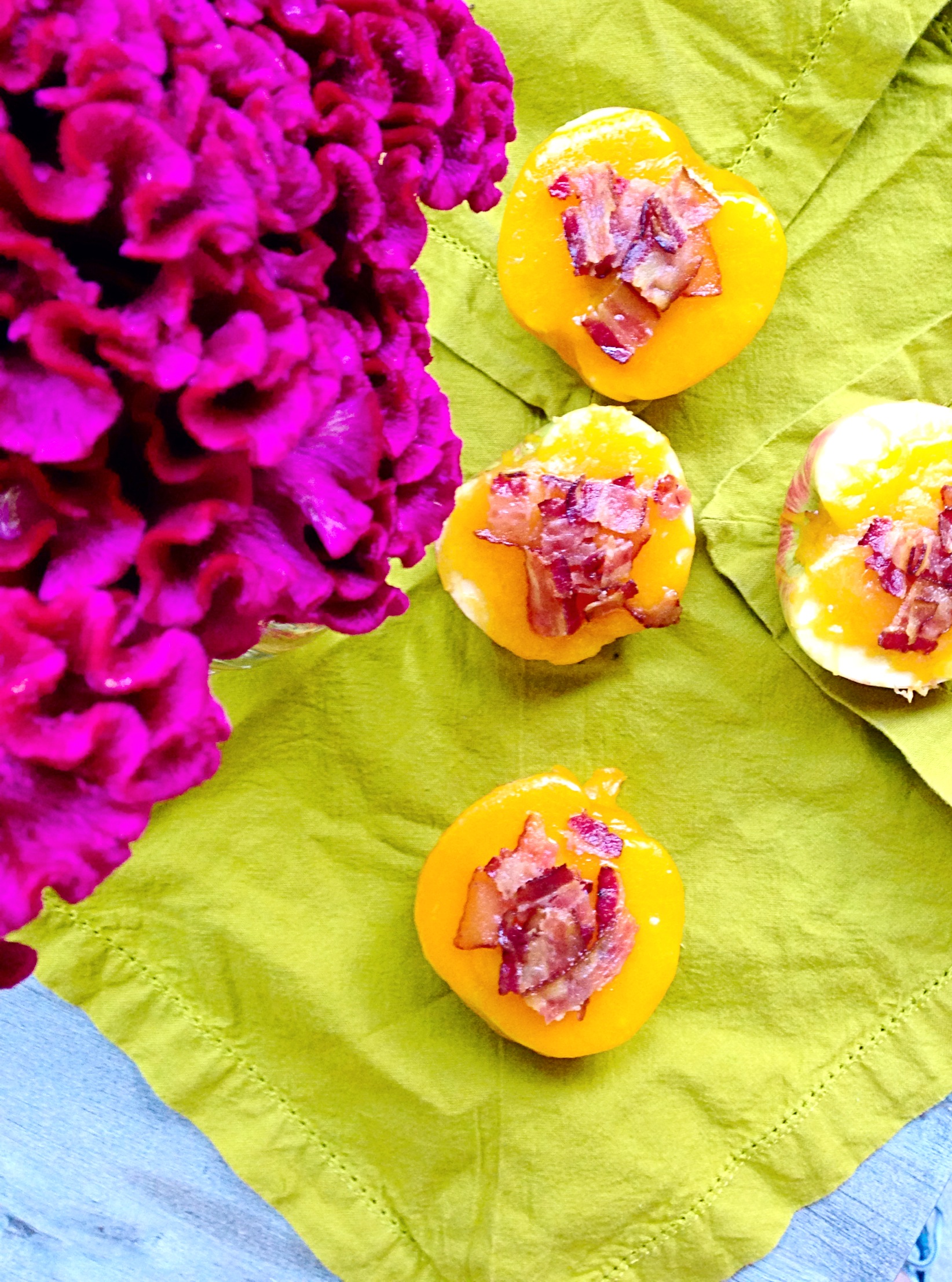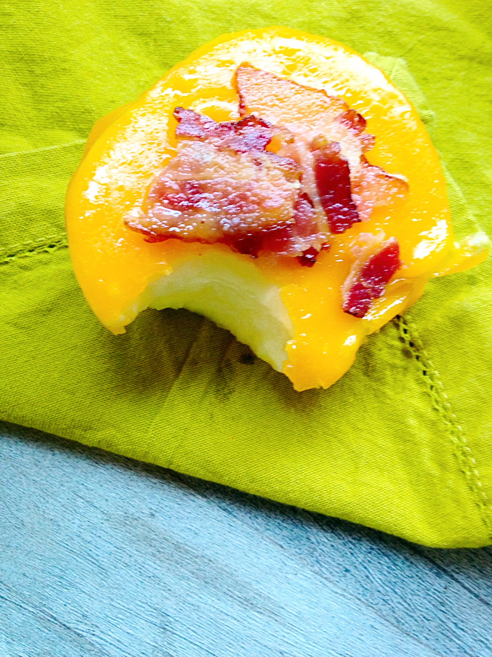 4. Layer one slice of cheese (or approximately 2 tablespoons shredded cheese) on apple and top with one piece of chopped bacon.