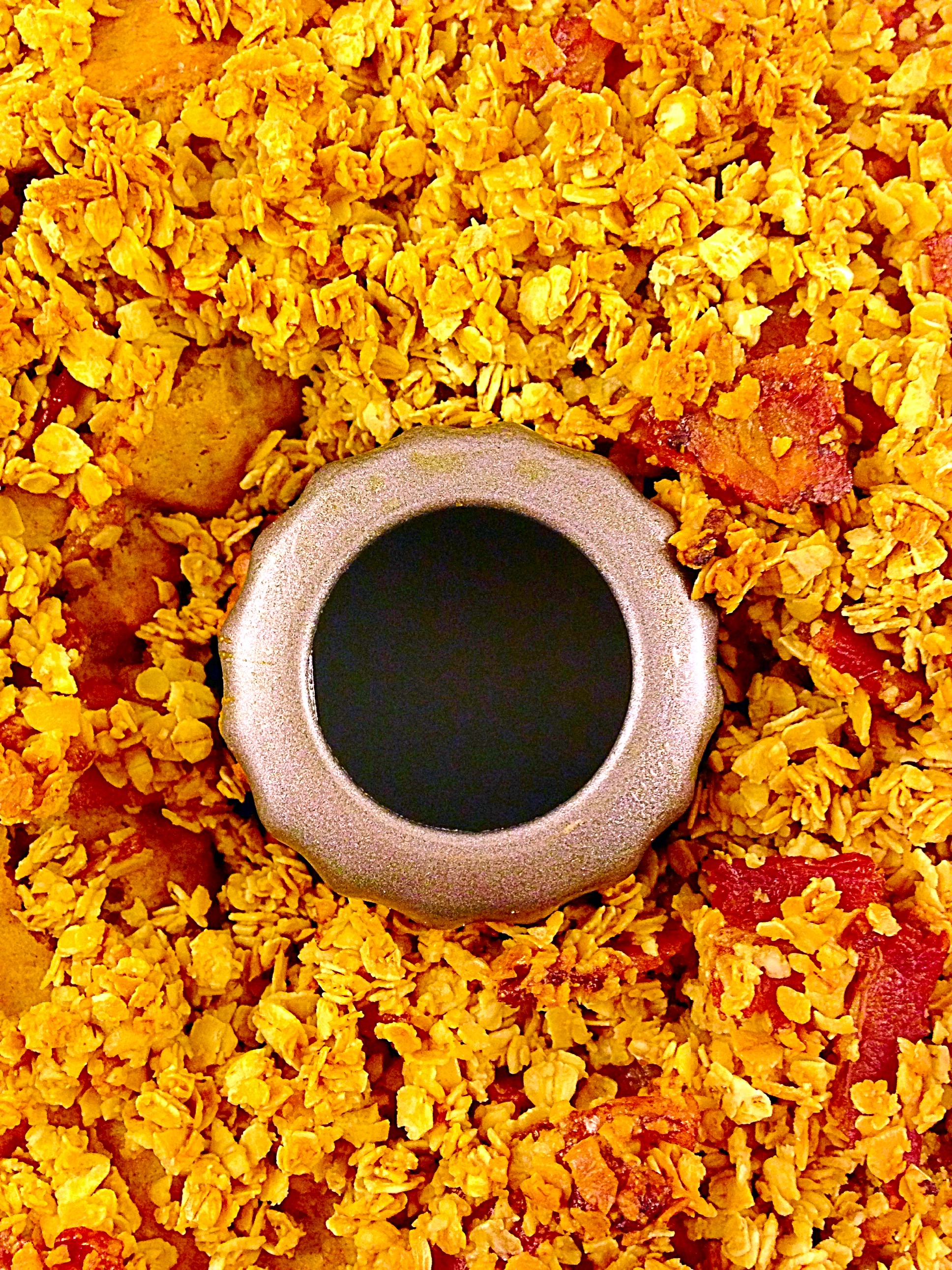 Description: Your appetite will be bursting at the banana peel with the smell of the PB³ (Peanut Butter Banana Bread) baking. Subtly sweet, moist and dulcet, this bread (which could also be considered a cake since there is no yeast) will have you cutting a second slice in a “Jiff” with the varied textures of the oat/bacon topping. With it’s sweet and occasionally salty bite (when you get a highly sought after piece of the bacon), you can easily convince yourself this can be eaten for breakfast, lunch OR dinner.