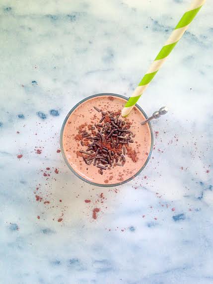 1. Combine all ingredients in blender, except cocoa powder and sprinkles, and blend until smooth and creamy.